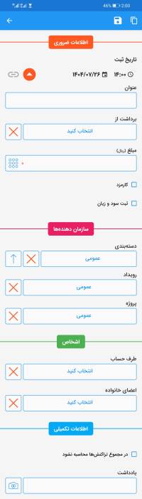 نواع تراکنش: به صورت یک آیکن با یک مثلث نمایش داده میشود. با هر بار لمس آن میتوانید نوع تراکنش را بین برداشت، واریز و انتقال تغییر دهید.